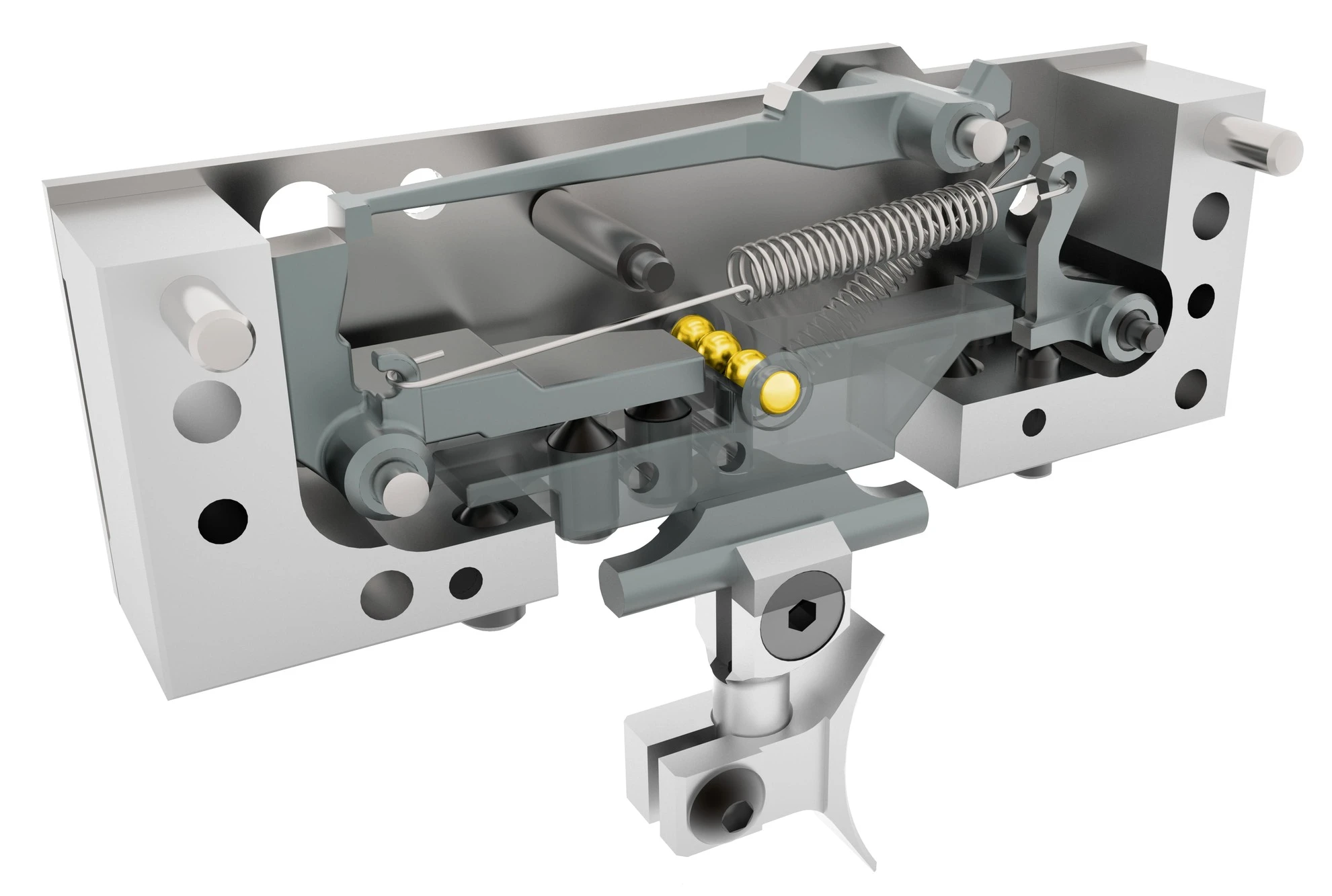Der patentierte Abzug 5065 4K besticht durch seine noch nie dagewesene extrem kurze Auslösezeit. Die Axialkugellagerung (4K = 4 Kugeln, gelb markiert) des Abzughebels garantiert eine absolut spielfreie Lagerung des Abzugzüngels. Der hierdurch erreichte harmonische und gleichmässig laufende Vorzugsweg lässt keine Wünsche offen. Der sehr klare Kontrast beim Erreichen des Druckpunktes, gibt dem Schützen einen sehr präzisen Kontakt zum Schuss.