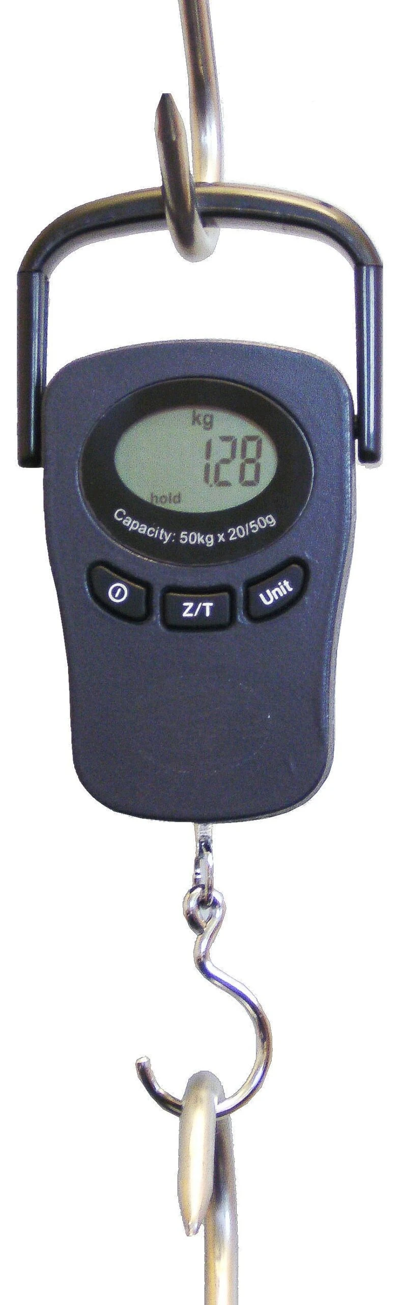 Elektronische Hängewaage 50 PRO bis 50 kg Belastbarkeit, mit 20 und 50 g Teilung. Integriertes Maßband, robustes Metallgehäuse und Lieferung mit Batterien.
