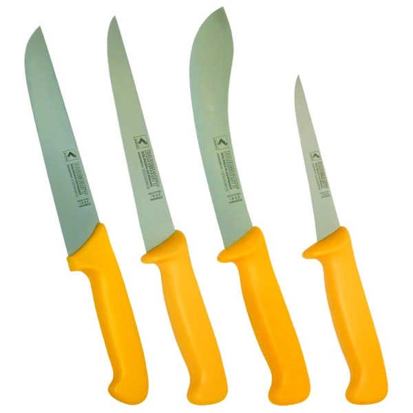 Ausführung | Hautmesser (Klingenlänger 18 cm), Stechmesser (Klingenlänger 18 cm), Fleischmesser (Klingenlänger 21 cm), Ausbeiner (Klingenlänger 13 cm) |