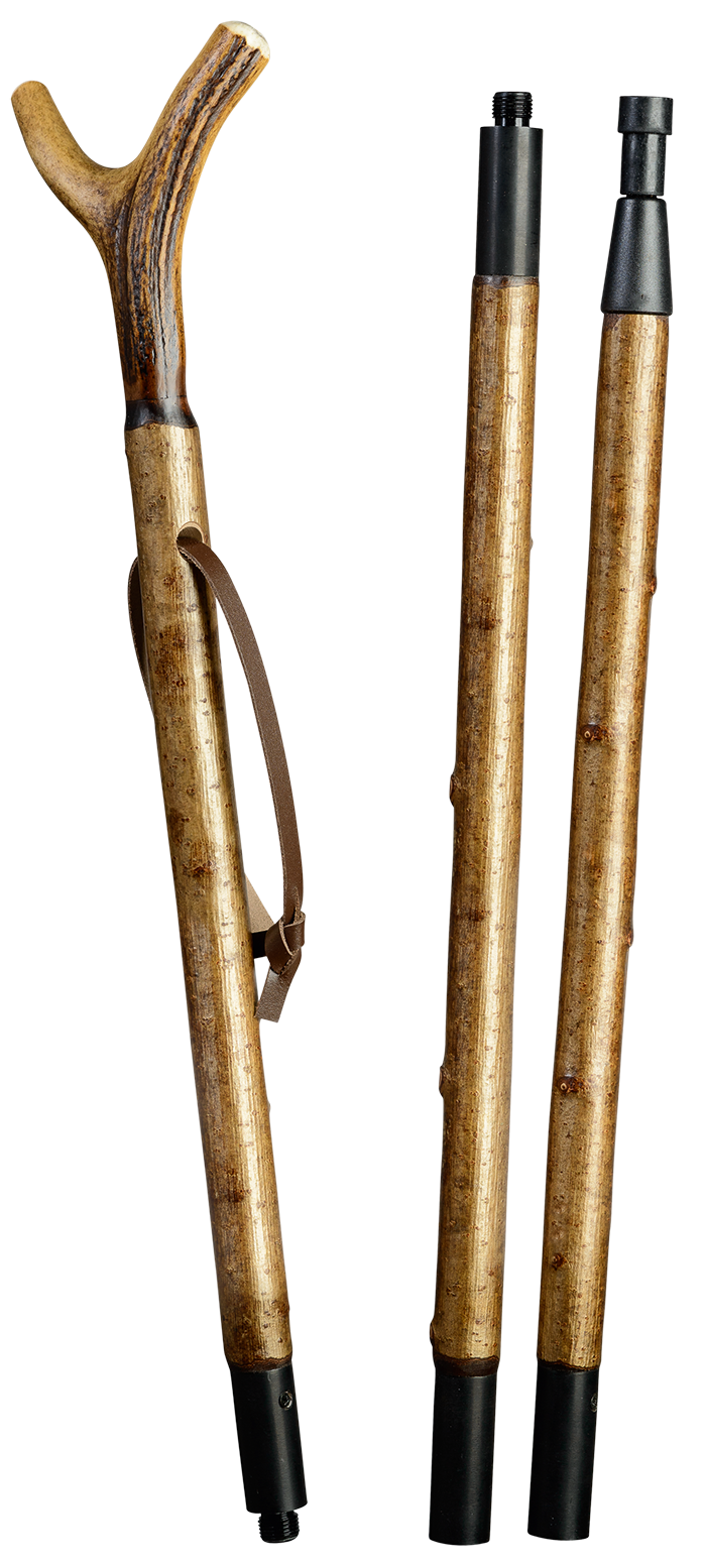 Exklusiver dreiteiliger Zielstock von Gastrock mit echter Hirschhorngabel, Haselstock aus eigener Plantage, stabil verarbeiteten Verschraubungen, handgefertigt, seidenmatt lackiert, mit Lederriemen. Mit Combi-Spike.