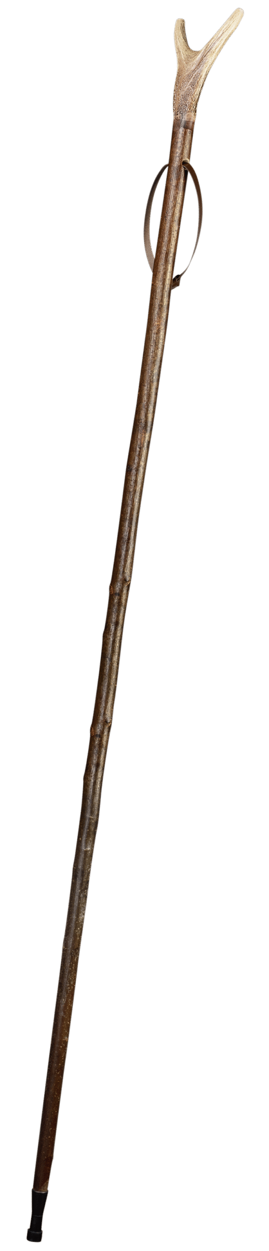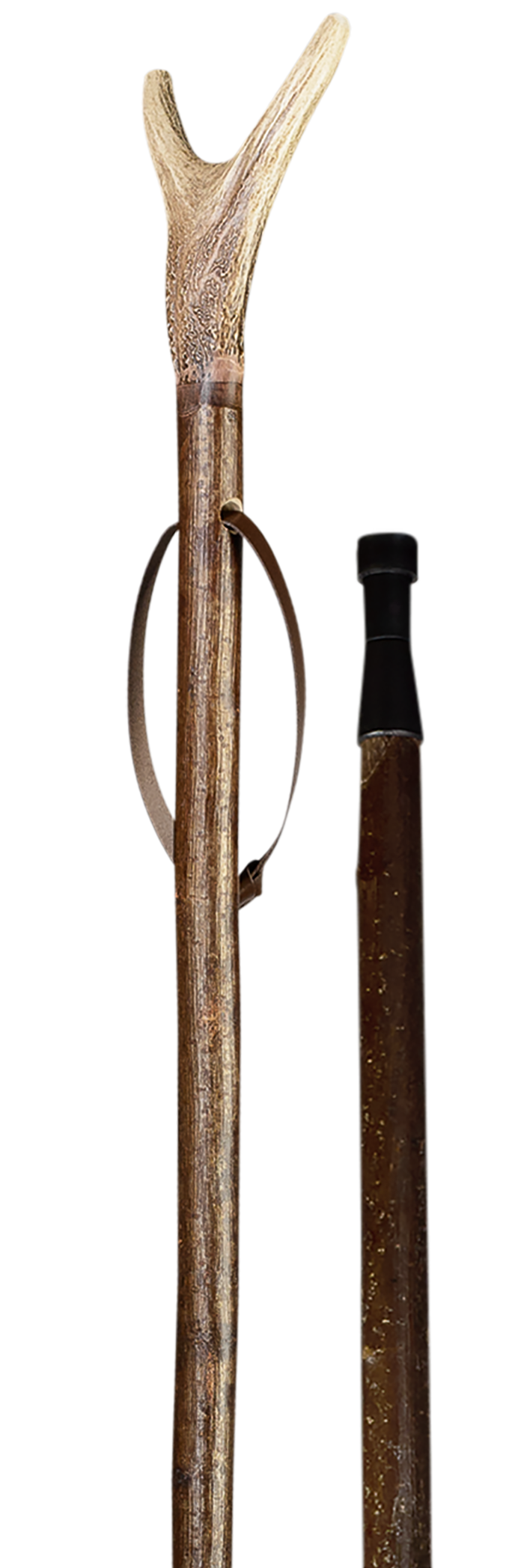 Exklusiver einteiliger Zielstock von Gastrock mit echter, handverlesener Hirschhorngabel, stabiler Haselstock aus eigener Plantage, handgefertigt, seidenmatt lackiert, mit Lederriemen. Mit Combi-Spike.