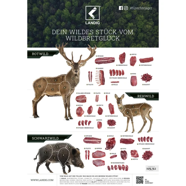 Mit dem Wildbretposter für echte Jäger haben Sie die Bezeichnung der Teilstücke von Rot-, Reh- und Schwarzwild immer parat.