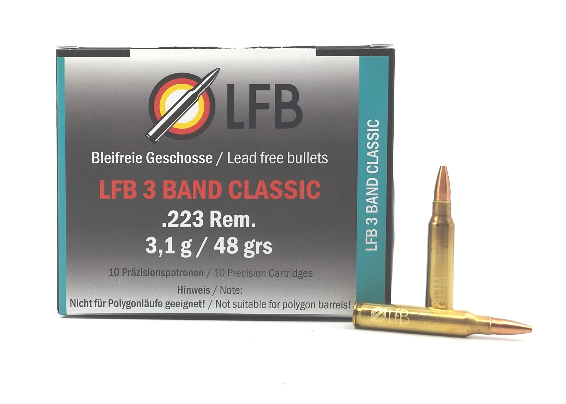 Beim Abfeuern kontaktieren herkömmliche Geschosse mit ihrem gesamten zylindrischen Führungsteil das Laufinnenprofil. Um diese Waffenbeanspruchung zu vermindern und die Leistung zu steigern, werden alle bleifreien LFB Geschosse, die aus einer homogenen Kupferlegierung bestehen, nach der LFB 3 Band Technologie hergestellt. Die LFB 3 BAND CLASSIC Geschosse berühren das Laufinnenprofil nur über die 3 Führungsbänder.