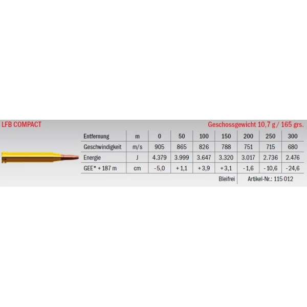 Bei der Entwicklung des bleifreien LFB COMPACT Geschosses stand die zuverlässige Deformation bei normalen Schussdistanzen im Vordergrund, daher wurde auf einen höheren BC-Wert verzichtet. Durch die zuverlässige Deformation des Geschosses im Wildkörper wird eine gute Schockwirkung erreicht. Das Geschoss wurde mit einem Scharfrand versehen, um für einen kreisrunden Einschuss und Schnitthaar zu sorgen.