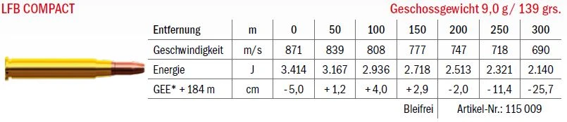 Bei der Entwicklung des bleifreien LFB COMPACT Geschosses stand die zuverlässige Deformation bei normalen Schussdistanzen im Vordergrund, daher wurde auf einen höheren BC-Wert verzichtet. Durch die zuverlässige Deformation des Geschosses im Wildkörper wird eine gute Schockwirkung erreicht. Das Geschoss wurde mit einem Scharfrand versehen, um für einen kreisrunden Einschuss und Schnitthaar zu sorgen.