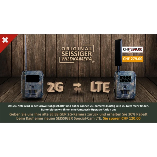 Swisscom stellt den Netzbetrieb auf Basis der 2G Technologie per Ende 2020 ein. Aufgrund dieser Umstellung können ab diesem Zeitpunkt alle 2G basierenden Kameras keine Bilder mehr übertragen. Egal wie alt Ihre Seissiger_Cam ist, Sie erhalten die neuste LTE Supersim Kamera mit 30% Rabatt auf den Neupreis. Eine Dienstleistung für unsere treuen Kunden.