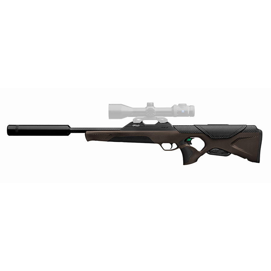 Der Walther RS3 Pro Chestnut mit dunkelbraunem Synthetikschaft und schwarzen Elastomer-Einlagen und griffiger Struktur. Zusätzliche Zweibein-Aufnahme am Vorderschaft.